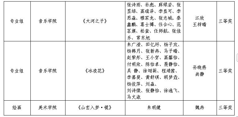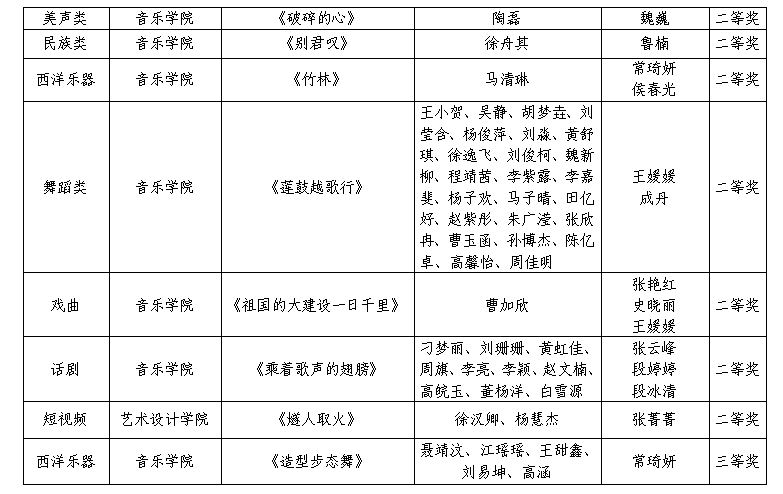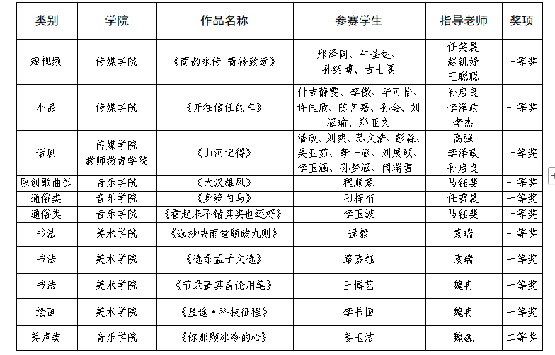 本届大学生科技文化艺术活动启动以来,学校精心组织,广泛动员,各学院积极参与,校团委统筹组织,共选送来自传媒学院、音乐学院、美术学院、艺术设计学院、教师教育学院的33件作品参与书法、绘画、短视频、声乐、戏剧、舞蹈、器乐、戏曲等多类别比赛。本次优异成绩的取得展示了我校美育教育的优质成果,彰显了我校青年师生良好的精神风貌,体现了学校坚持“五育并举”的育人成效。